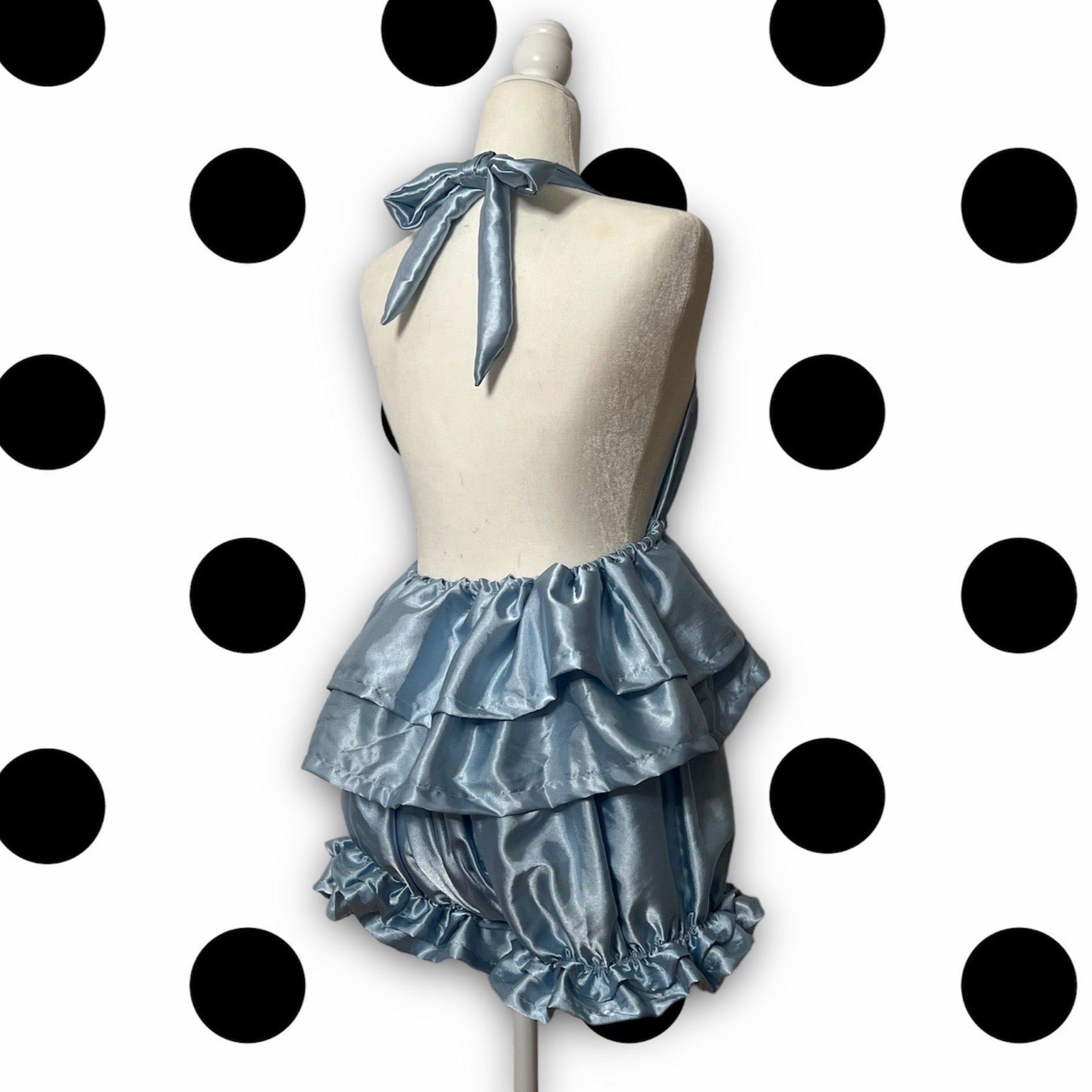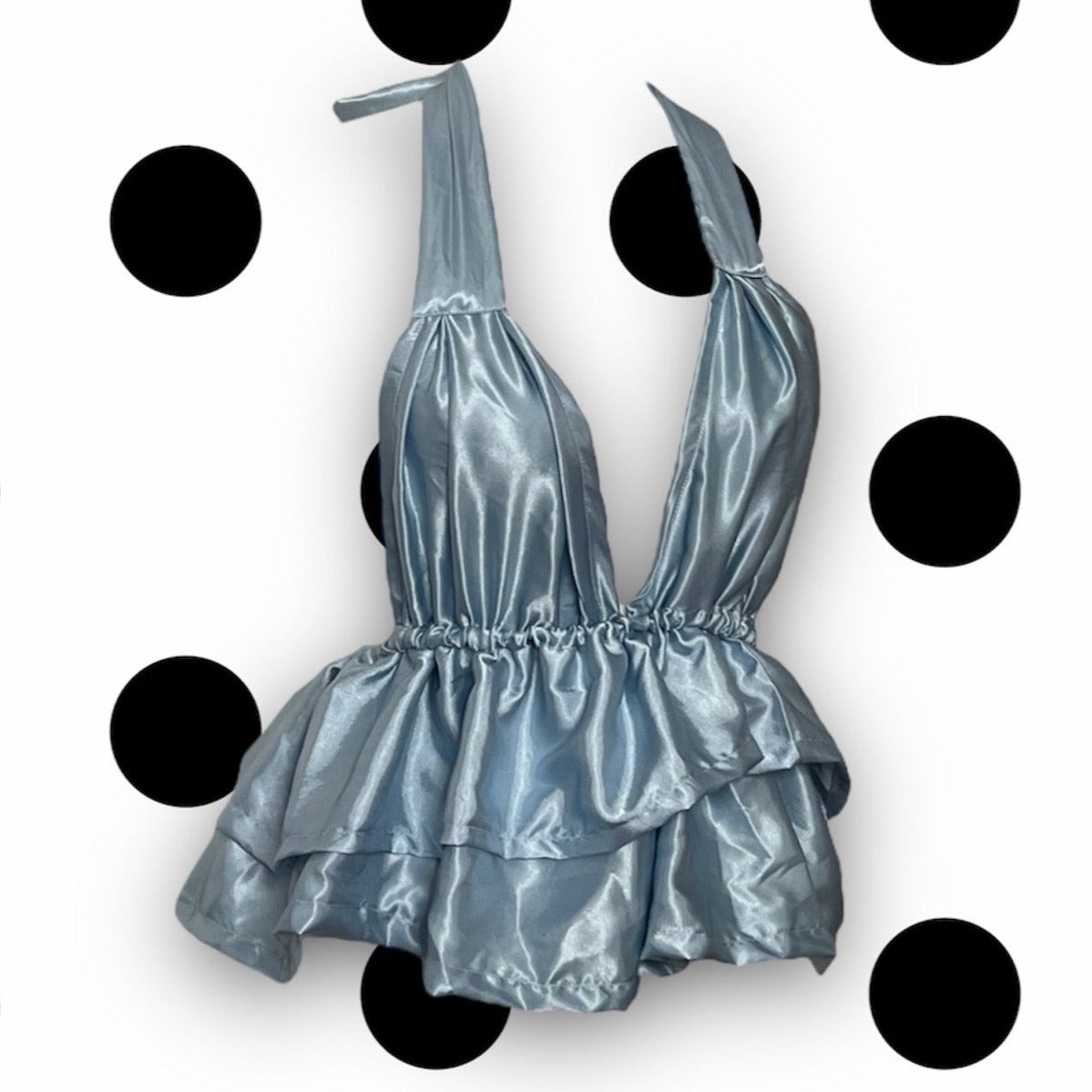Ruffled satin blue pajama top. Made from old bed sheets so you know they're comfy :)